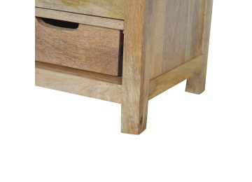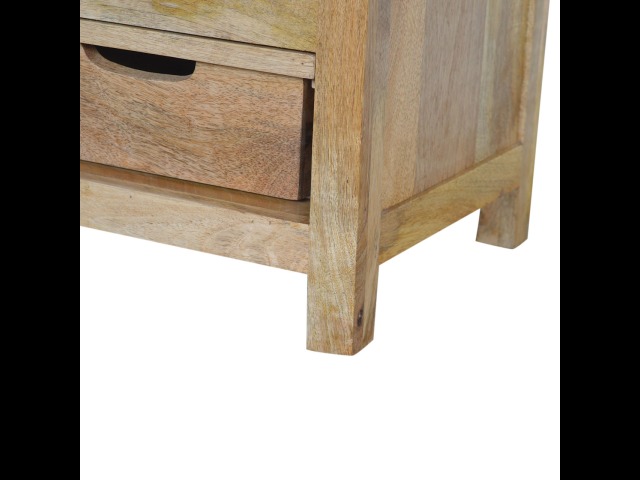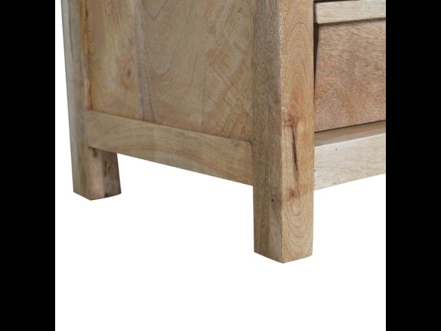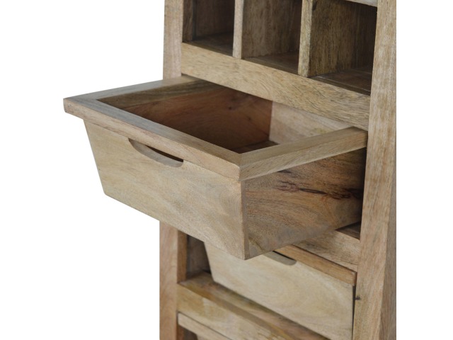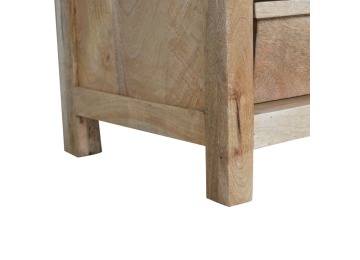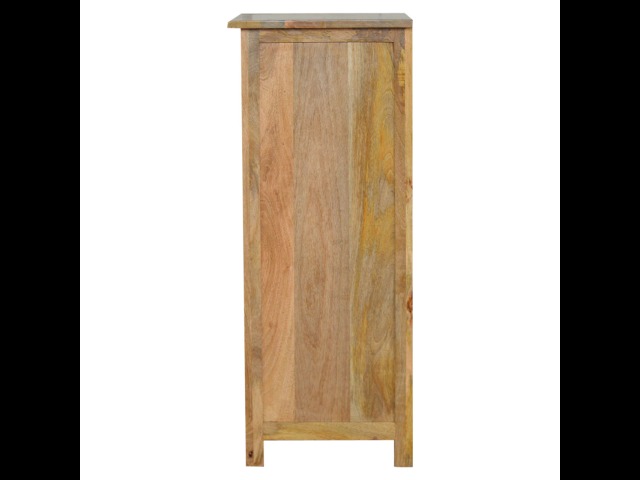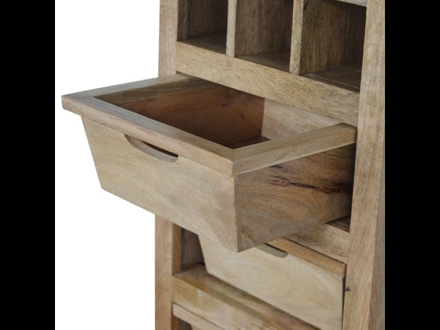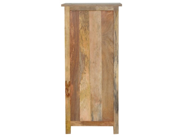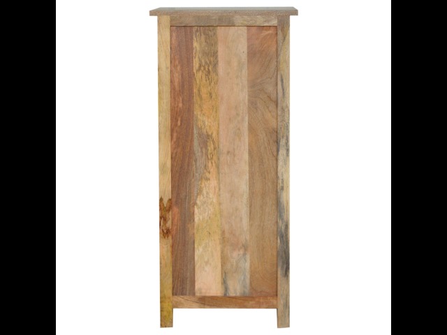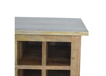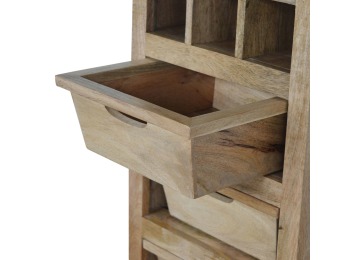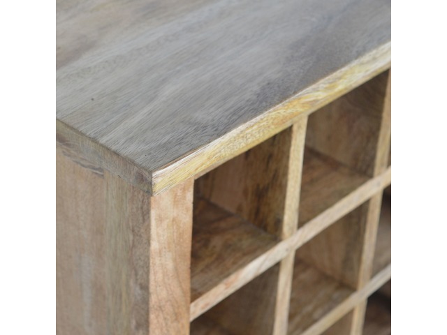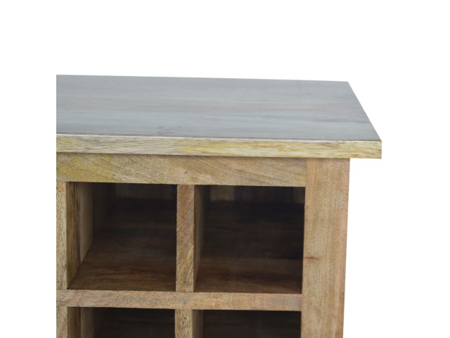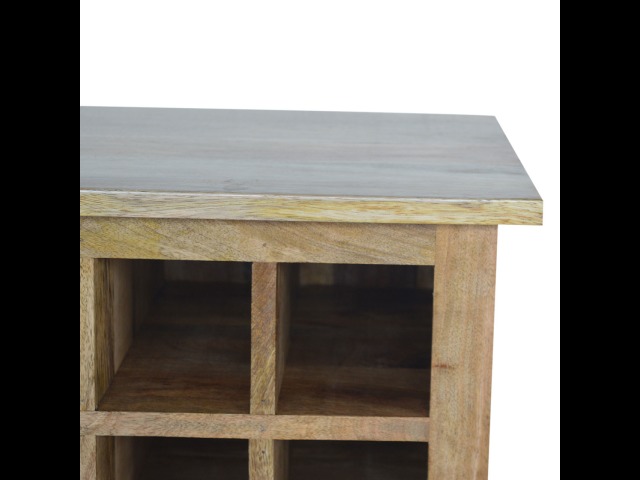 This is a beautifully handcrafted cabinet that offers 3 drawers and 9 wine bottle slots, it is constructed from 100% solid mango wood with an oak-ish finish. The slots are ideal to store any wine bottles and groceries or bits and bobs for the kitchen on the lower three shelves. It is practical storage that is built to last and is the perfect addition to any kitchen or dining room. Every piece of furniture is individually handcrafted and includes swing care tickets explaining the cautions and aftercare instructions.