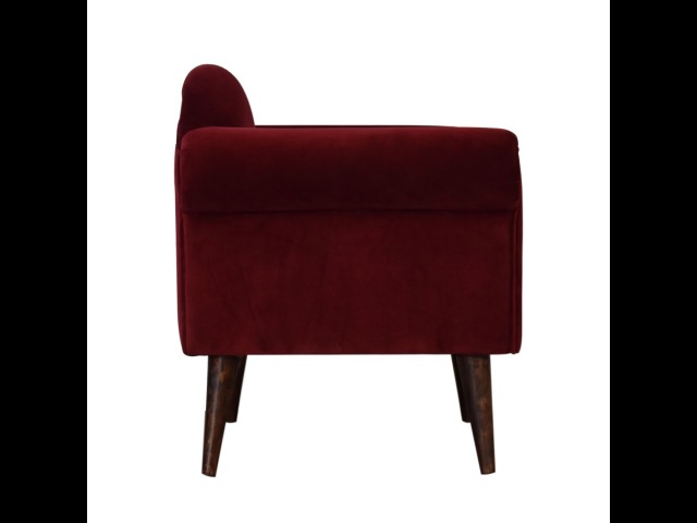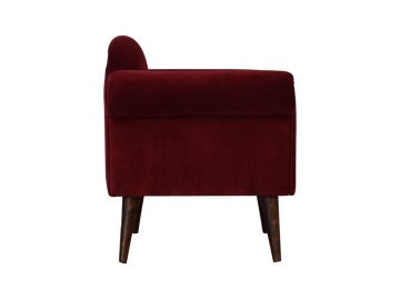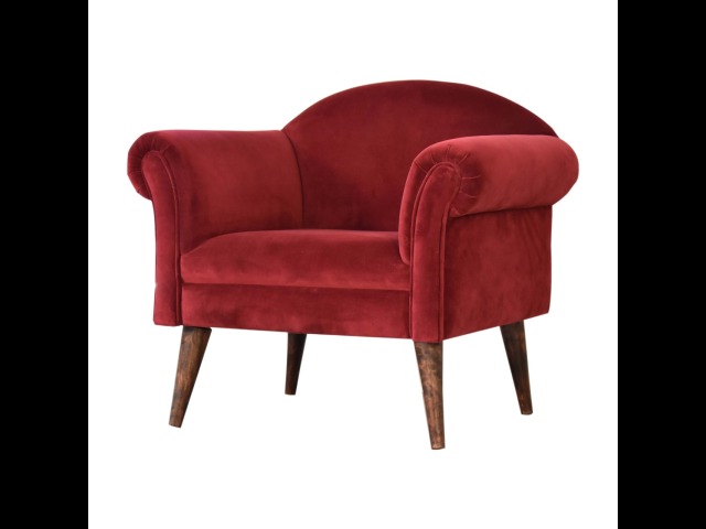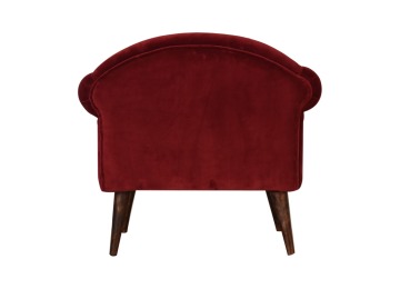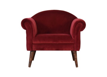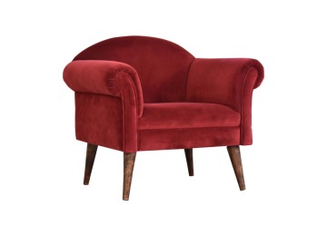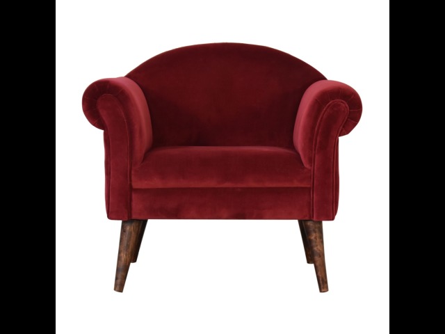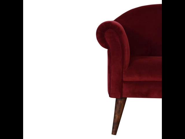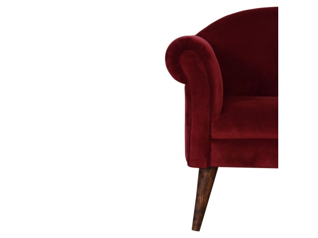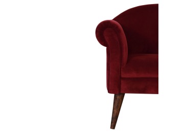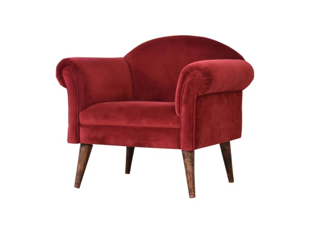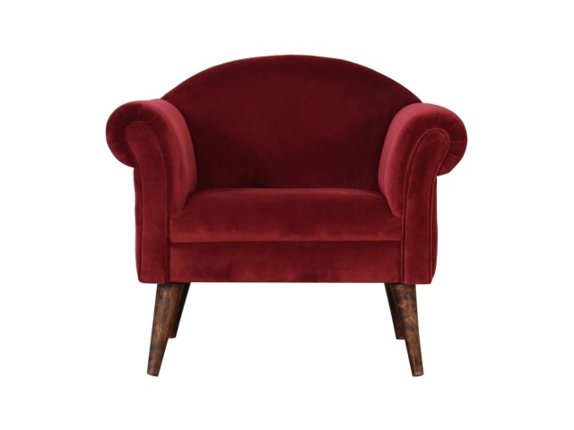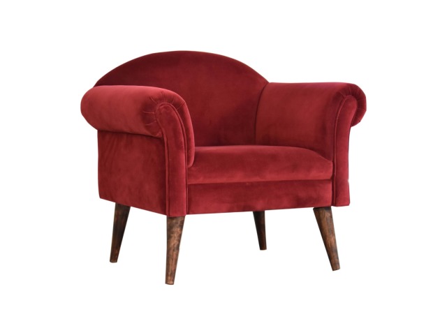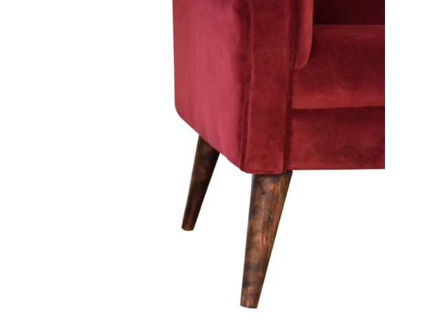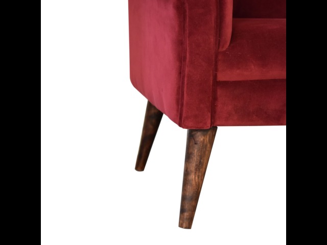 This armchair has been upholstered in a luxurious wine cotton velvet and features 4 nordic style legs constructed from 100% solid mango wood. This is a statement piece which can be added as a pop of colour to any room in the home or can be paired with many different styles and colours of interiors both modern or classic.